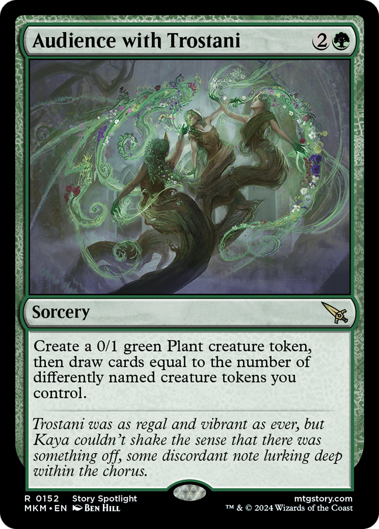 Create a 0/1 green Plant creature token, then draw cards equal to the number of differently named creature tokens you control.