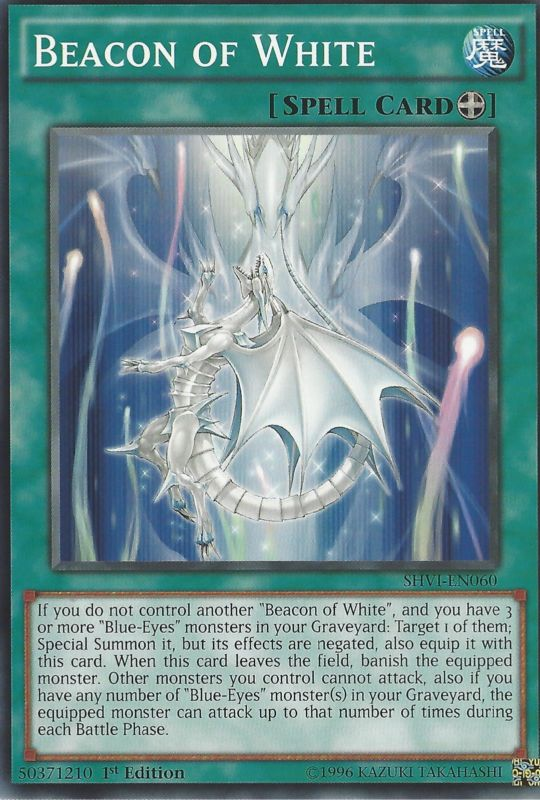 If you do not control another "Beacon of White", and you have 3 or more "Blue-Eyes" monsters in your Graveyard: Target 1 of them; Special Summon it, but its effects are negated, also equip it with this card. When this card leaves the field, banish the equipped monster. Other monsters you control cannot attack, also if you have any number of "Blue-Eyes" monster(s) in your Graveyard, the equipped monster can attack up to that number of times during each Battle Phase.