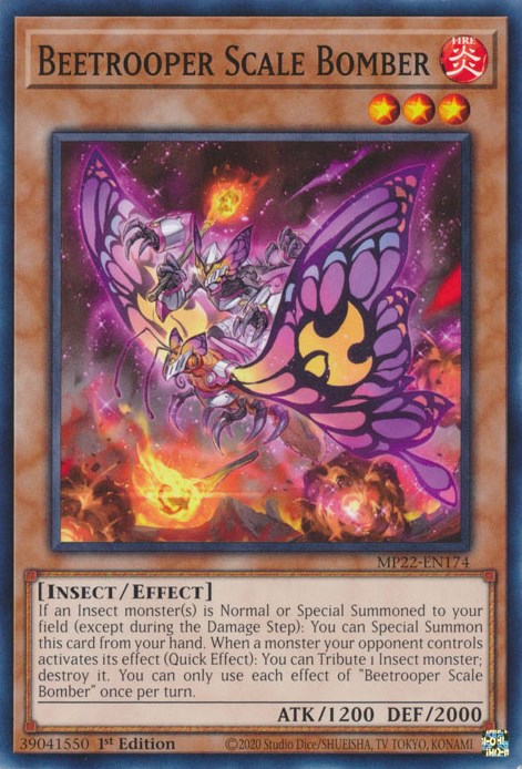 If an Insect monster(s) is Normal or Special Summoned to your field (except during the Damage Step): You can Special Summon this card from your hand. When a monster your opponent controls activates its effect (Quick Effect): You can Tribute 1 Insect monster; destroy it. You can only use each effect of "Beetrooper Scale Bomber" once per turn.