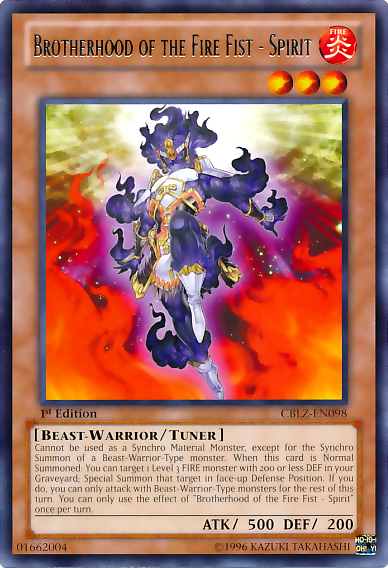 Cannot be used as a Synchro Material Monster, except for the Synchro Summon of a Beast-Warrior-Type monster. When this card is Normal Summoned: You can target 1 Level 3 FIRE monster with 200 or less DEF in your Graveyard; Special Summon that target in face-up Defense Position. If you do, you can only attack with Beast-Warrior-Type monsters for the rest of this turn. You can only use the effect of "Brotherhood of the Fire Fist - Spirit" once per turn.